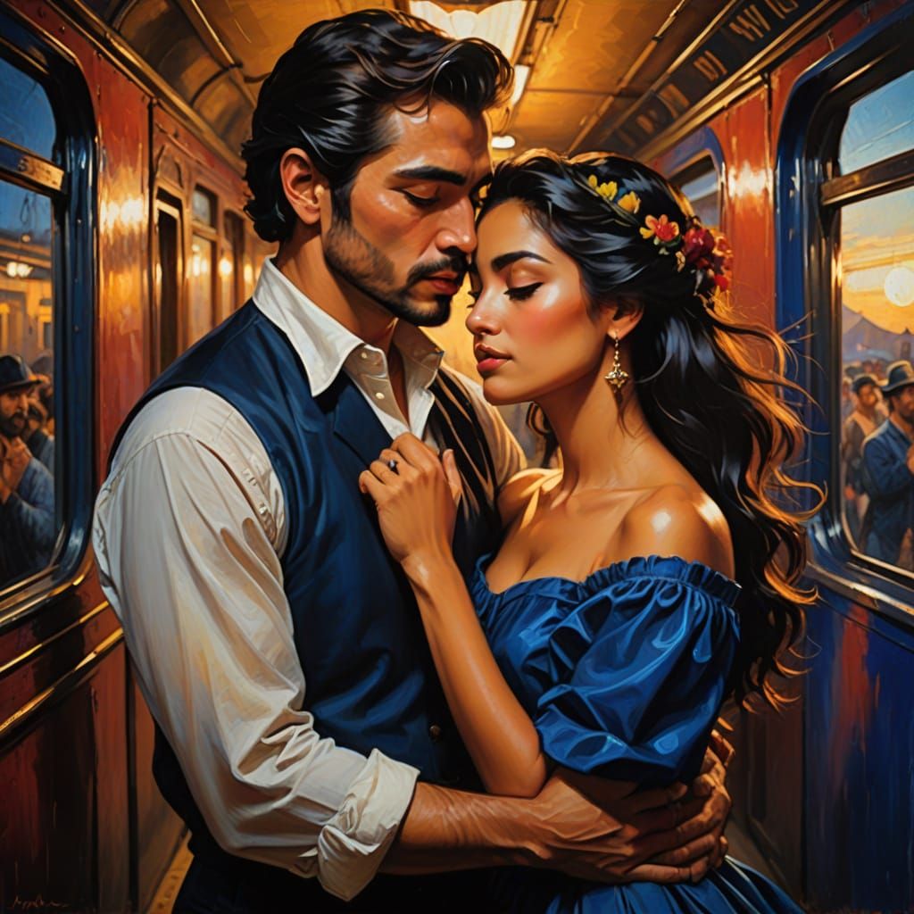 A romantic oil painting of a tender kiss between a handsome man and a beautiful woman, set against the backdrop of a classic royal blue train, with warm golden light and soft focus, inspired by the dramatic lighting of Velázquez.