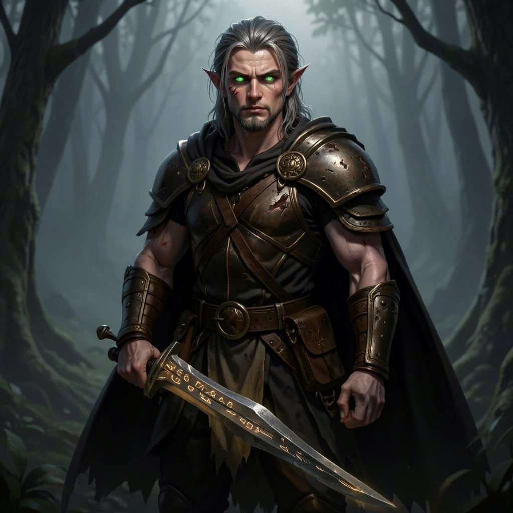 This image shows a serious young male warrior in dark leather armor and a cape, holding an ancient sword in a misty forest. Features include silver hair, green eyes, and a scar. Dark fantasy realistic style with cinematic lighting.