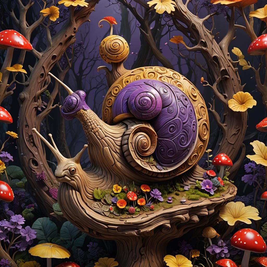 A hyperdetailed wooden sculpture showing a large snail on a mushroom. The dark fantasy art features dynamic lighting and deep colors in a purple and yellow complementary scheme.