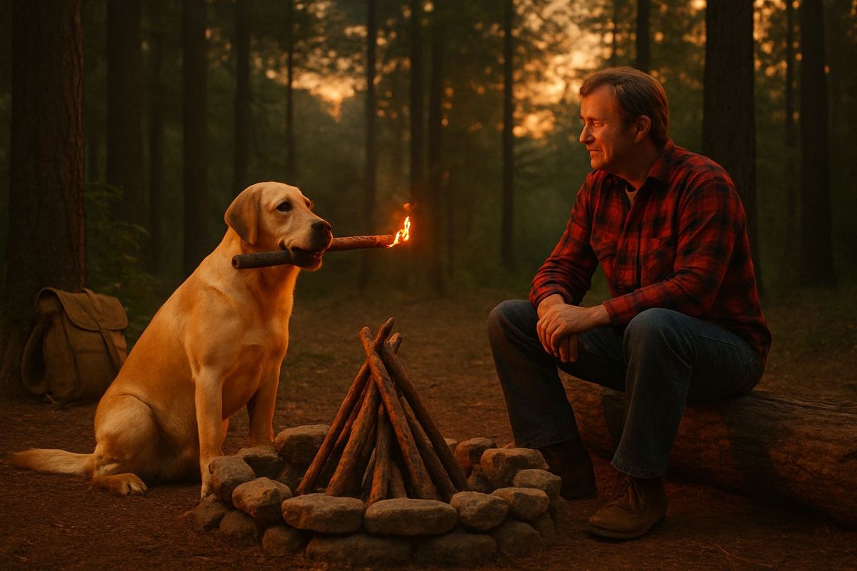 This image captures a golden hour moment of a dog holding a burning branch to light a campfire. A man watches with amusement, evoking a warm, analog film aesthetic.