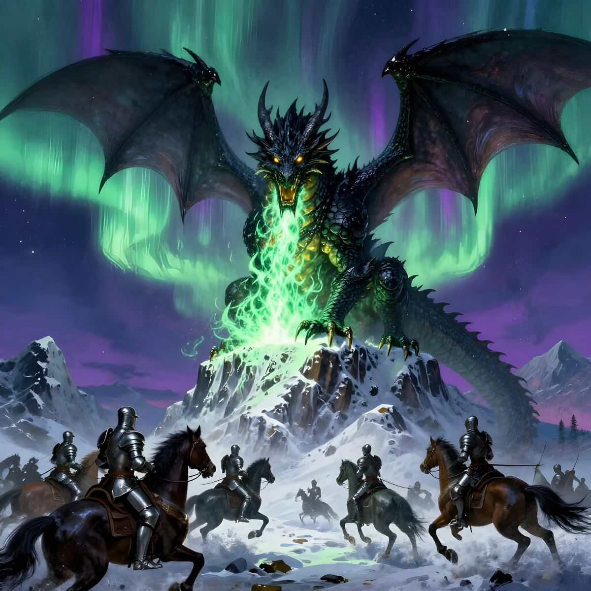 This image depicts an ancient dragon on a mountain peak, unleashing fire against approaching knights, all under a starry sky illuminated by the aurora borealis.