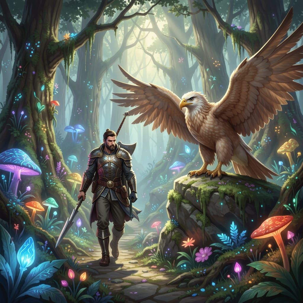 This image shows a man encountering a griffin in a magical, glowing forest. Rendered with rich colors and intricate details, it features cinematic lighting and a fantasy art style.