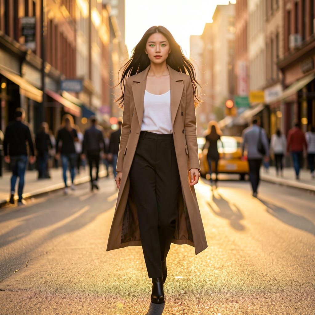 This photorealistic image captures an elegant Asian woman with long black hair and green eyes walking down a vibrant city street during golden hour, presented in a high-fashion editorial style.
