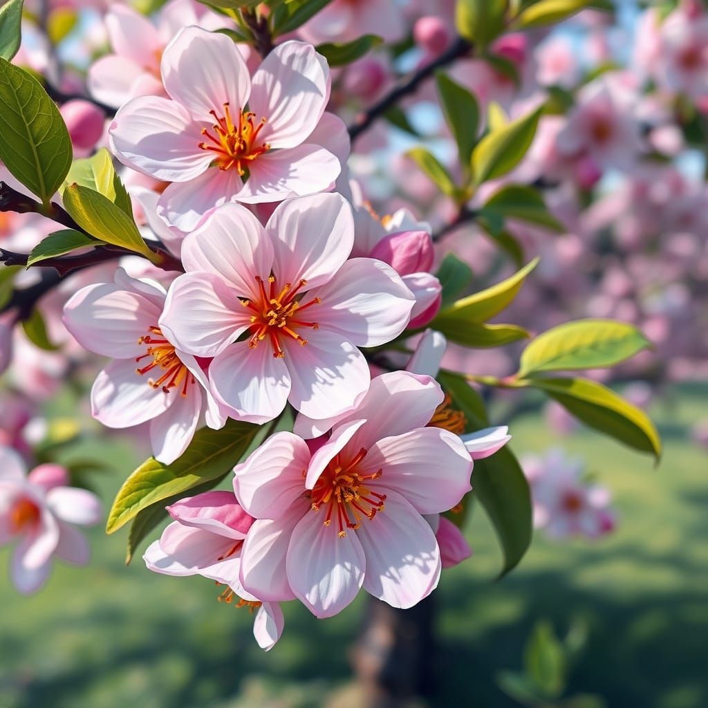 This image shows a close-up of a plum tree in full bloom, with an orchard in the background. It has a vibrant, detailed feel, presented as a digital oil painting.