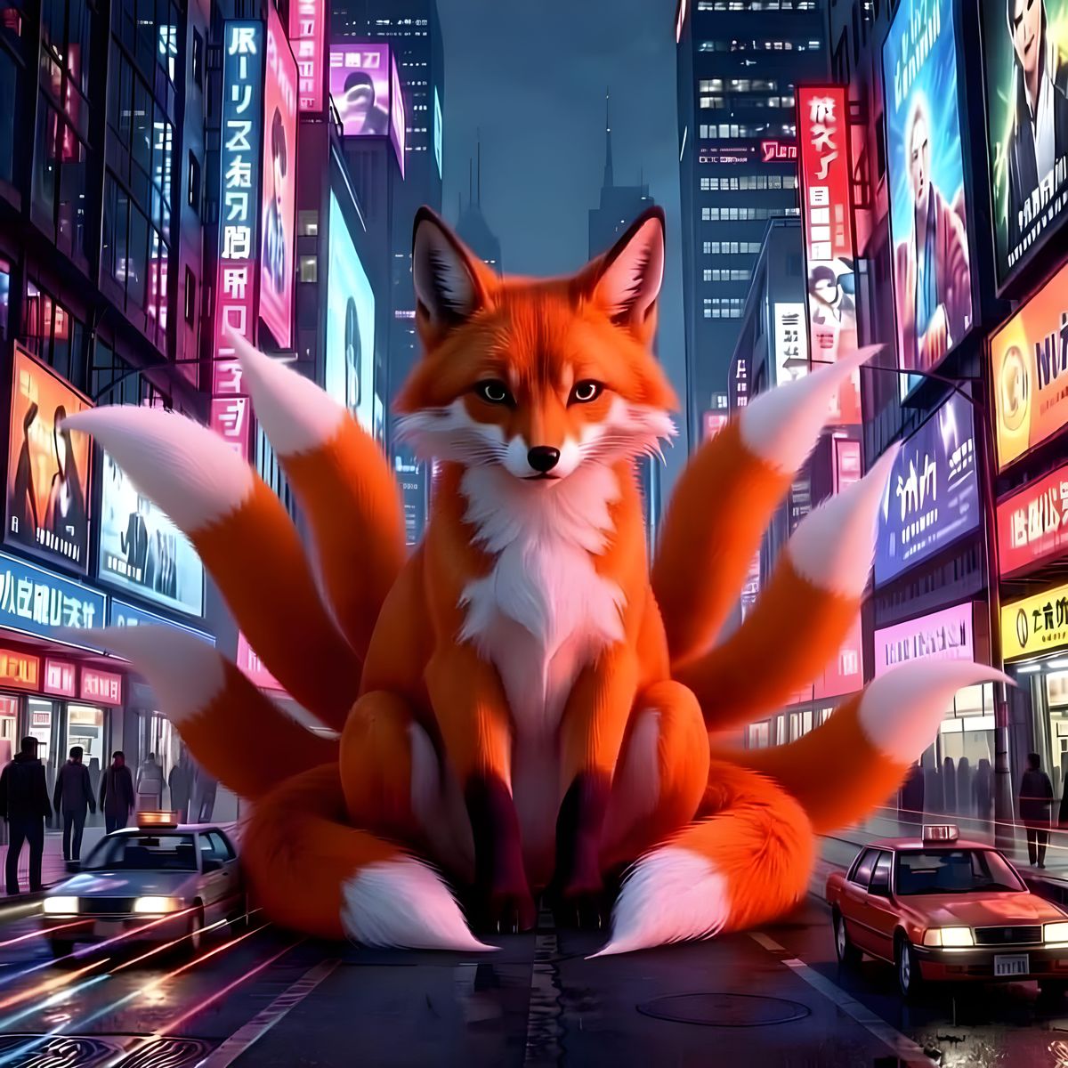 This image depicts the colossal nine-tailed fox, Kurama, slumbering calmly amidst the bustling activity of a city's streets, creating a striking contrast.