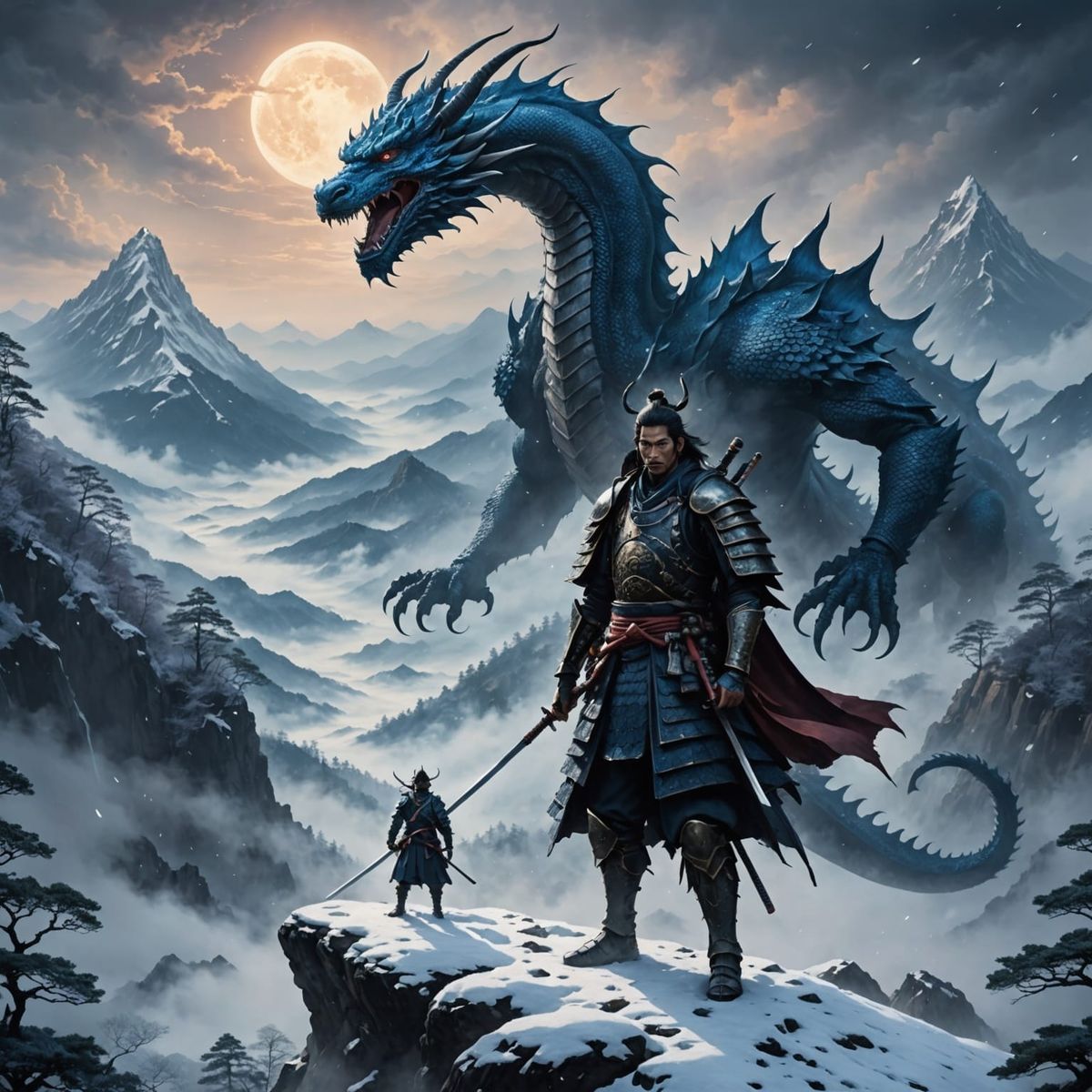 A lone samurai warrior with traditional Japanese armor, standing atop a snow-capped mountain peak, overlooking a vast, mystical forest shrouded in mist. A giant, ethereal blue dragon made of stardust and nebulae coils in the sky above. The scale is immense and breathtaking, evoking a sense of profound ...