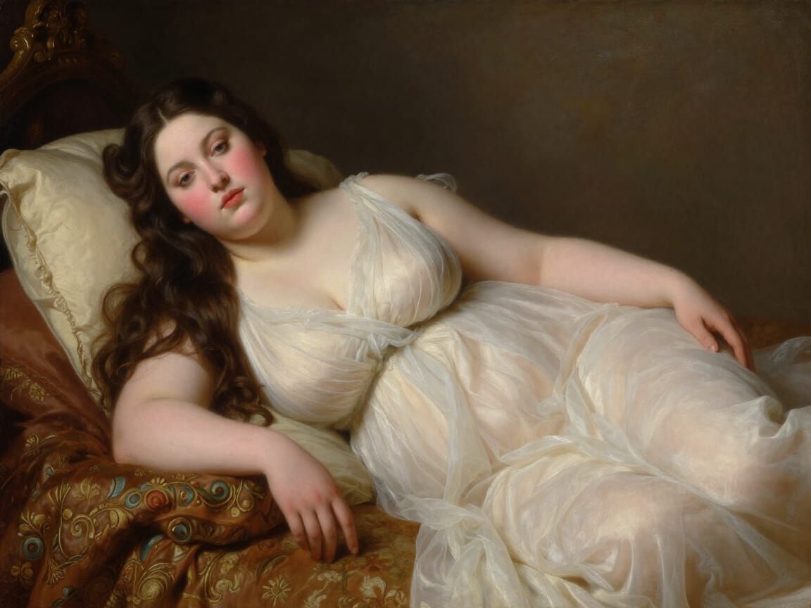 This image shows a noble European woman in a sheer nightgown, resting on a bed. The oil painting features soft lighting and rich textures in a Victorian fine art style.