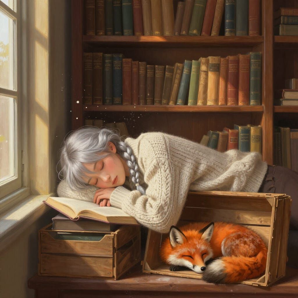 This image shows a peaceful scene of a woman sleeping in a window nook, surrounded by books. A small fox sleeps nearby in a crate, bathed in warm afternoon light. Digital painting with soft lighting and painterly textures.