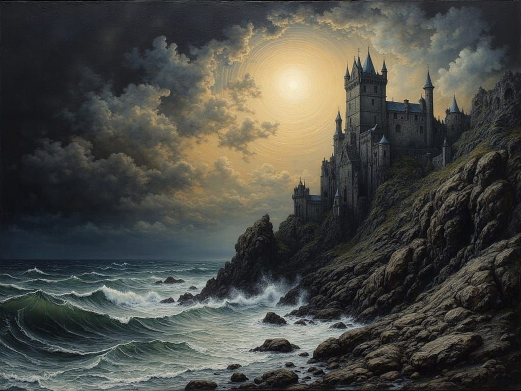 A dramatic painting of a castle ruin overlooking a turbulent sea. Dark, roiling clouds break apart to unveil a brilliant full moon.
