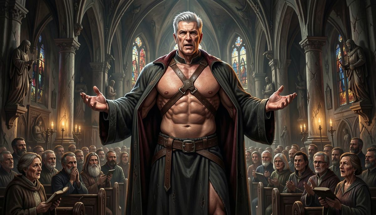 This image depicts a powerfully built executive priest delivering a sermon in a church. Rendered in a hyperrealistic dark fantasy concept art style with high contrast and rich colors.