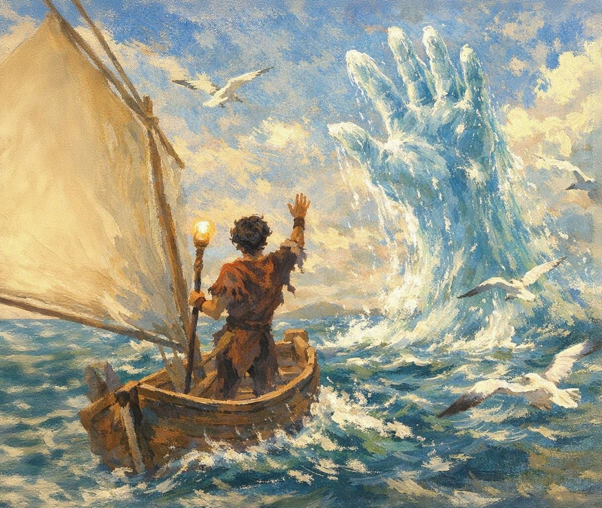 This image shows Ged from Earthsea on his boat, wielding magic and waving goodbye to a water hand. Painted in an impressionist style with seagulls and ripped clothing.