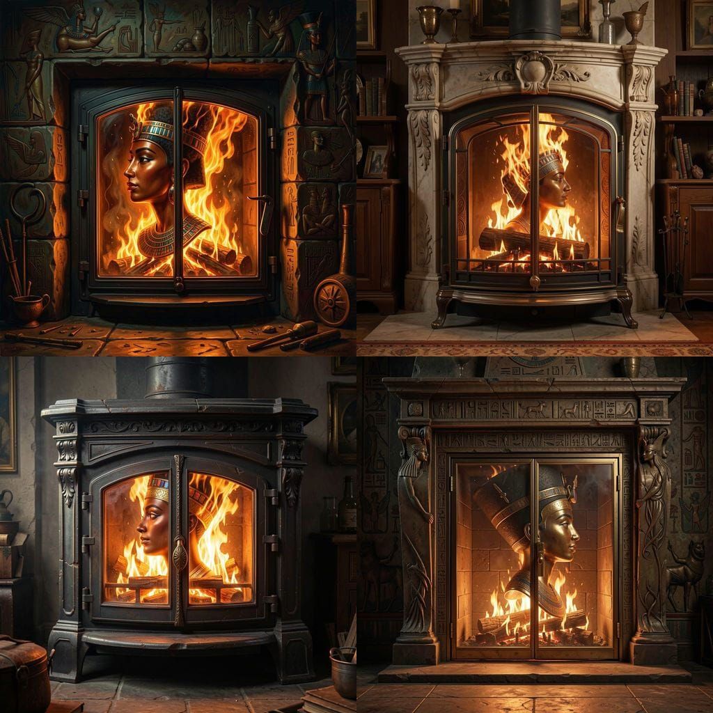 Generate unique images of fireplaces with Nefertiti profiles and fiery heads. Try our free AI image generator now!
