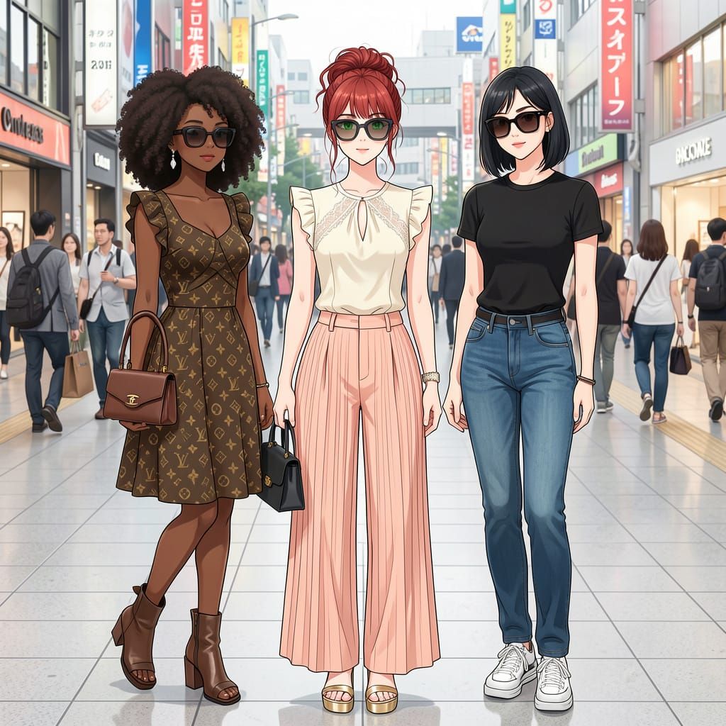This image depicts three stylish women of diverse ethnicities enjoying a shopping day in Ginza, Tokyo. The scene highlights fashionable outfits and a vibrant urban atmosphere.