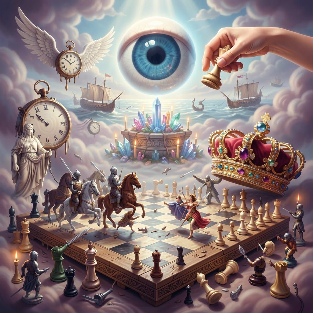 A colossal living chessboard with battling pieces, knights, and a queen. Features a giant crown, melting clocks, Viking ships, and a watchful eye, rendered in a photorealistic surrealist style with dramatic lighting.