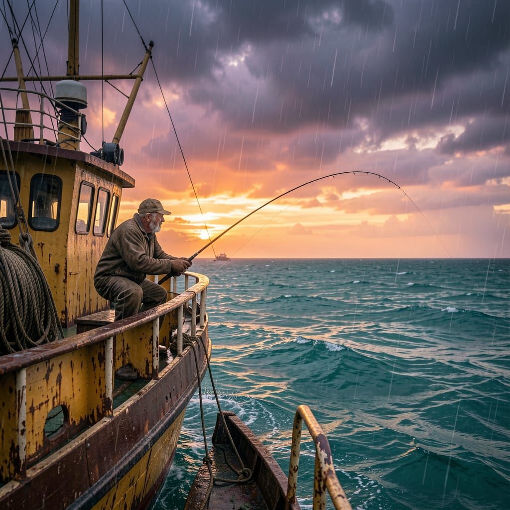 This image depicts a weathered fisherman on an old trawler at sunset. The scene features choppy teal ocean waters under a dramatic, rainy sky, rendered in atmospheric realism with photorealistic textures.