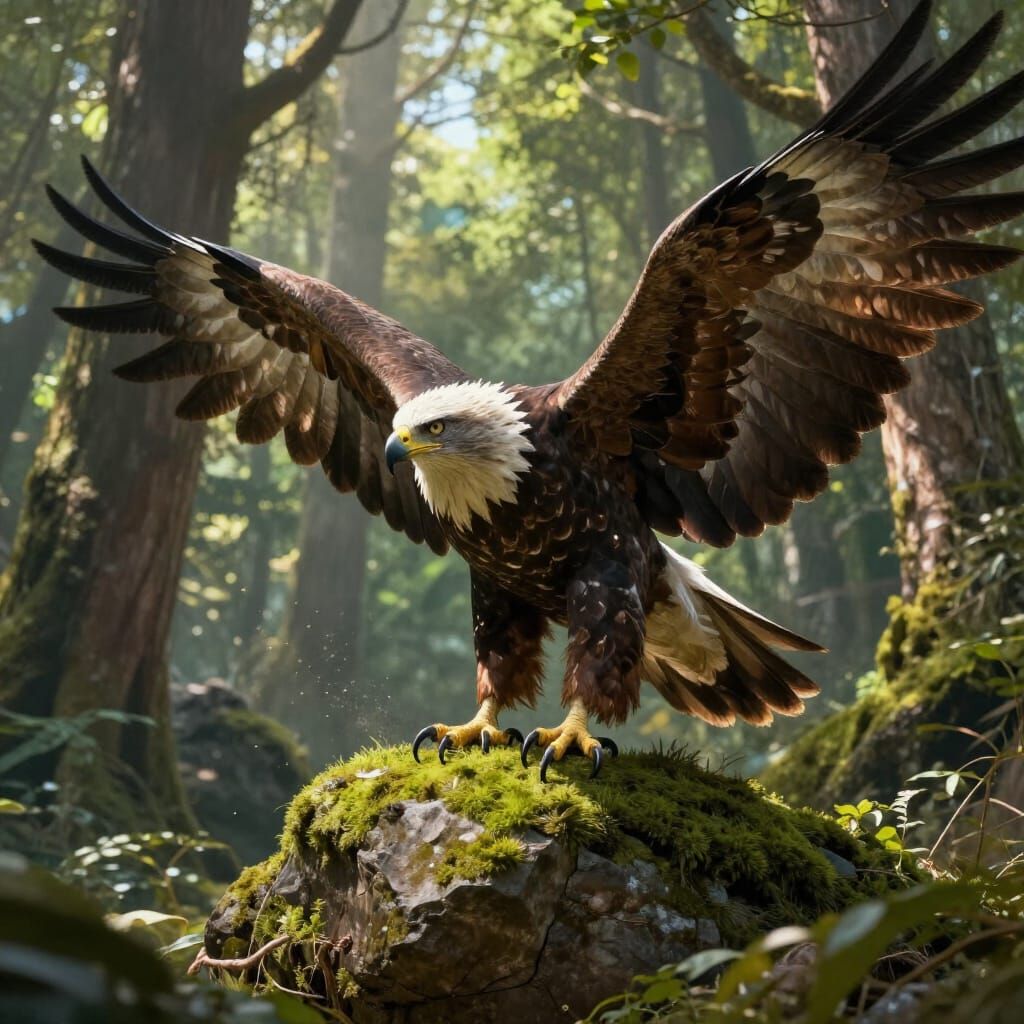This concept art features a detailed illustration of a majestic eagle on a mossy rock in an ancient forest. Sunlight filters through the canopy, highlighting the bird's features with a vibrant, natural palette.