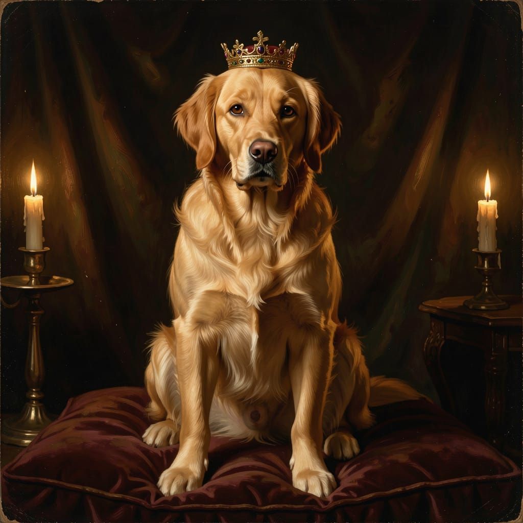 This image shows a golden retriever wearing a crown, sitting regally on a velvet cushion. The scene uses dramatic lighting and chiaroscuro, rendered in a hyperrealistic digital painting style.