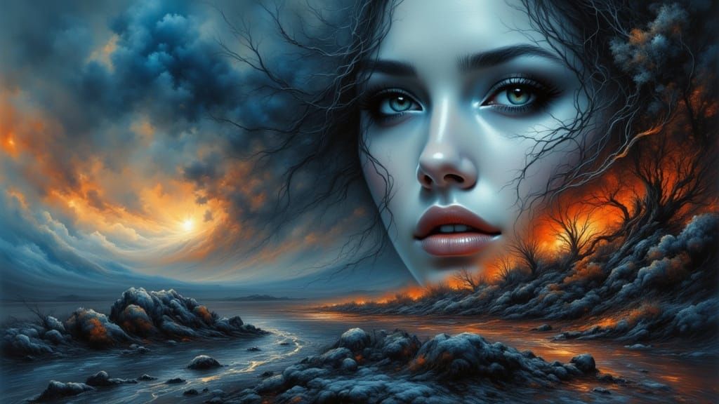 A hyperrealistic portrait of a surreal landscape. Deep blue shadows contrast with vibrant orange highlights in this visually captivating, high-contrast scene.