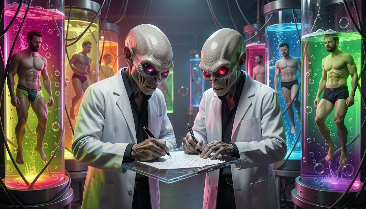 Beautiful, precise, accurate and creepy image of two Roswell liฬ‚e aliens. They are wearing white coat and taking notes on a transparent notepad. Around them are sleeping men in underwear floating in bubbleling multicolor fluo water in glass tubes, bubbles and wires.The image is creepy and anguishing
