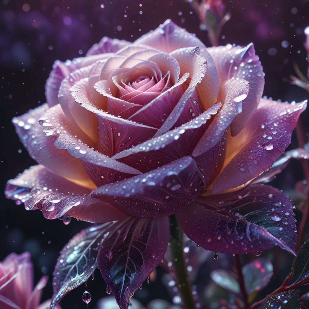 This image shows a close-up of a crystalline rose radiating inner light. Delicate petals shimmer with dewdrops, rendered in a surreal, high-detail fantasy art style with soft pink and purple gradients.