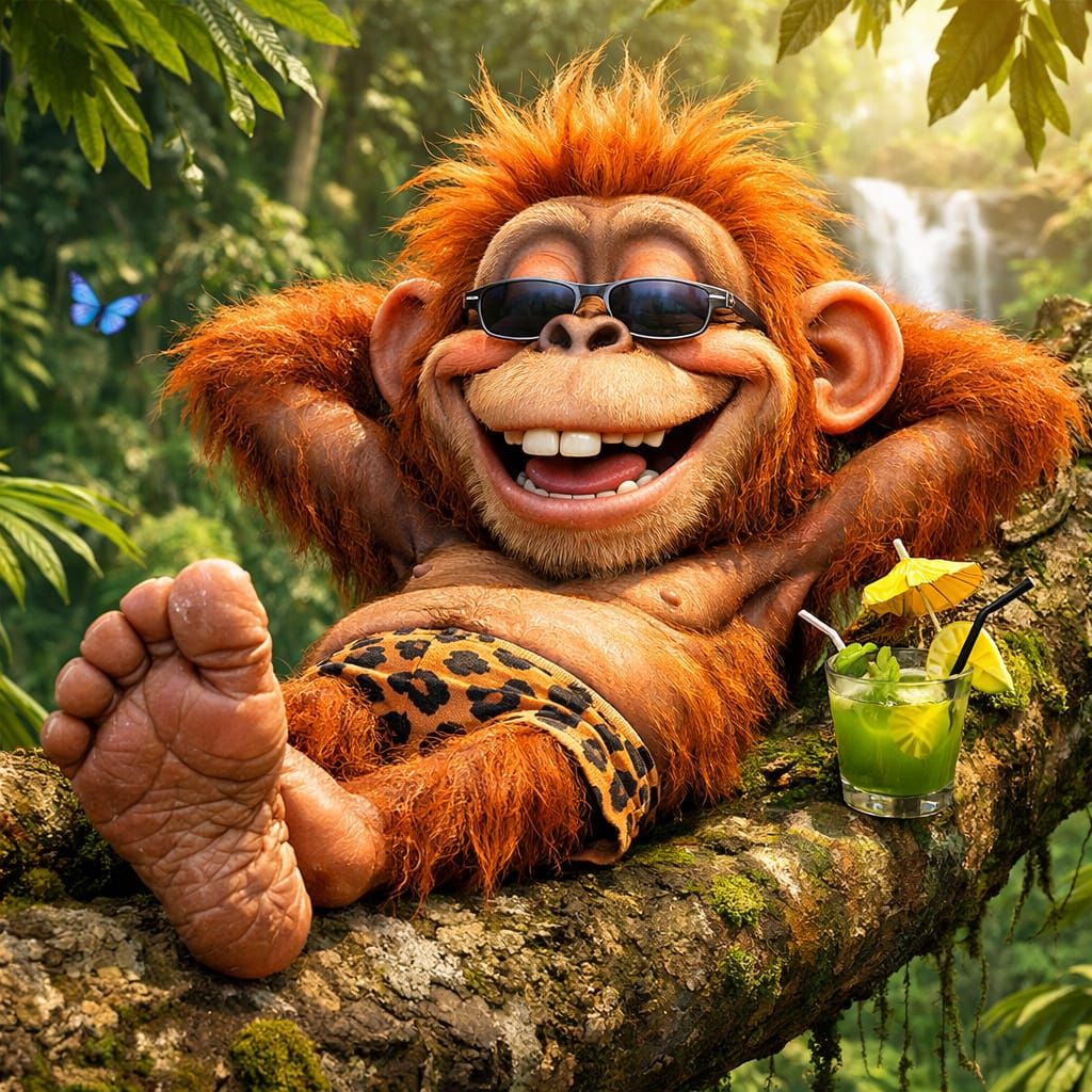 This image shows a detailed CGI caricature of a goofy, cute orangutan relaxing and sunbathing in a lush rainforest tree.