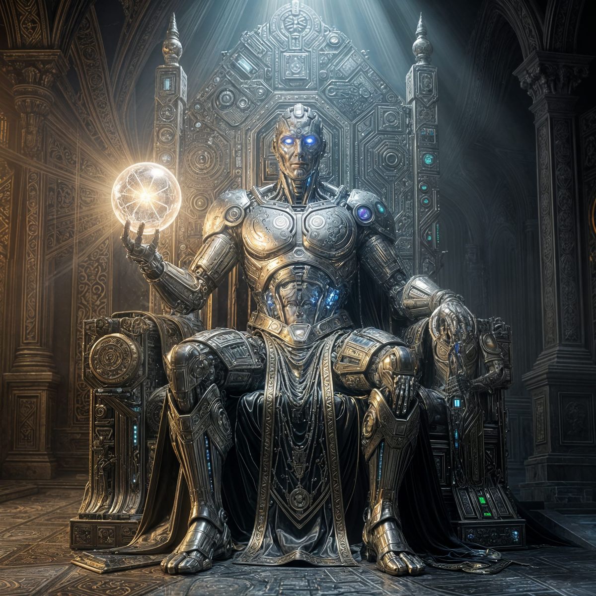 A hyperrealistic image of a cyborg deity on a throne of circuit boards, holding a luminous orb. Features dramatic, baroque lighting and a divine, mythological ambiance.
