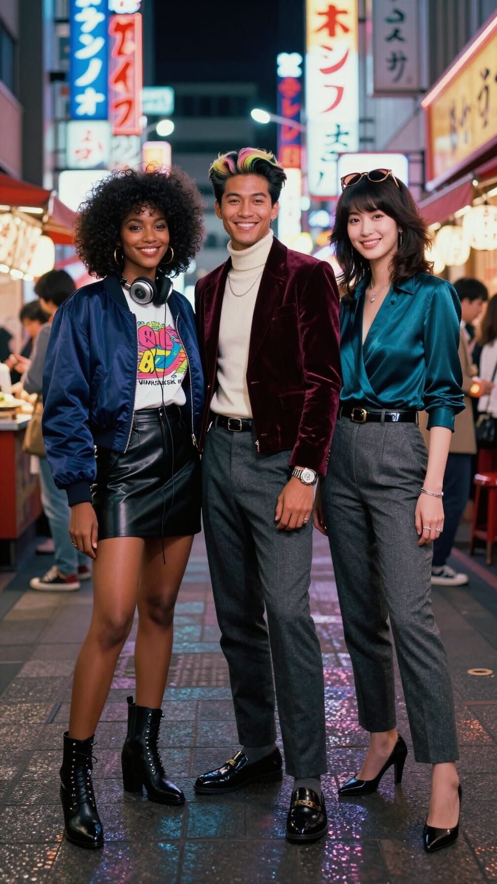 A vibrant AI-generated image capturing a diverse group of young adults in an 80s-inspired urban setting under vibrant neon lights. Features detailed fashion and retro accessories.