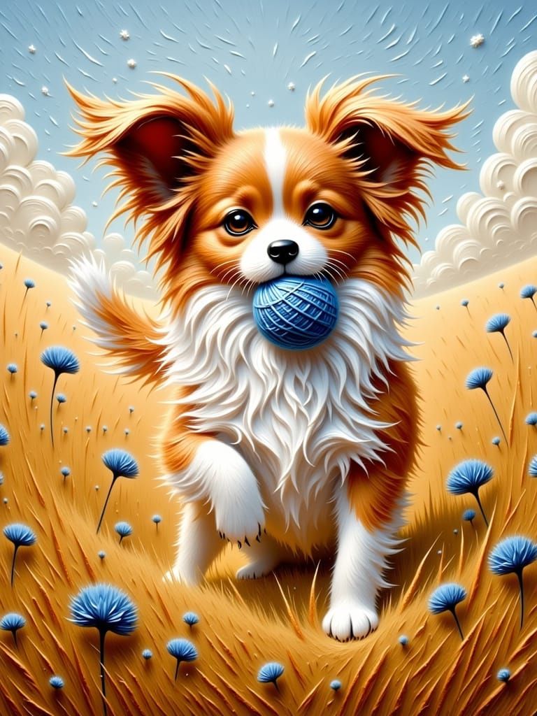 <lora:CuteFlux:0.8> <lora:ImpastoFlux:1.0> A Sable & White Papillon dog with expressive, fluttering ear fringes stands in a field of tall grass, an endearing, playful pose, holding a tiny blue knitted ball in its mouth. A dramatic wind sweeps past, its face irresistibly cute. The wind pulls the fur into ...