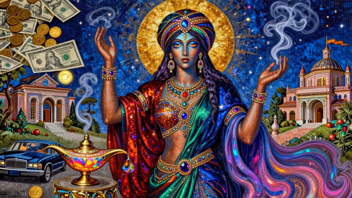 2/20/2026-"byzantine mosaic Surreal Portrait Segmented collage of wishes being granted of money and gold, love, jewelry, mansion, limo by a Magical Ge...Art By Archangel Tara