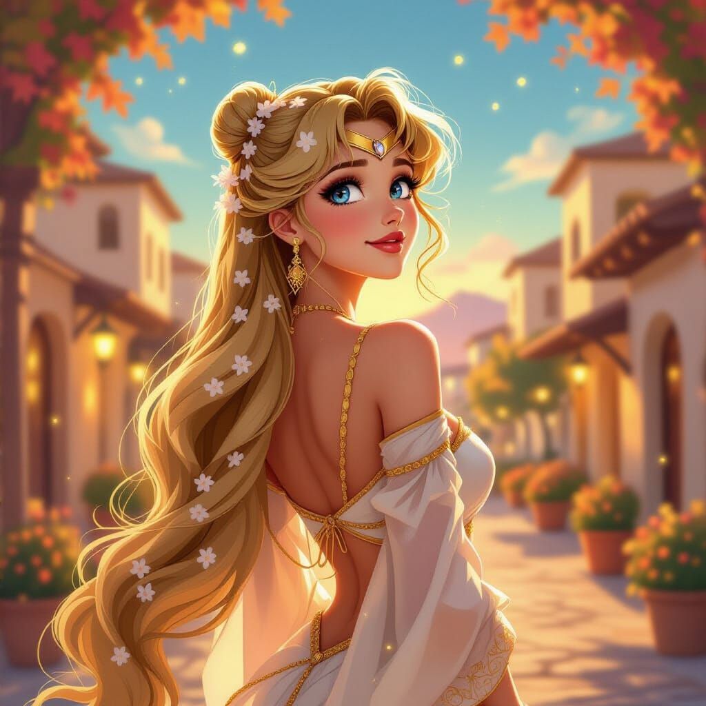 This image depicts a princess in a warm desert market at dusk, adorned with flowers and jewelry. The art style is a blend of magical realism and vibrant fantasy illustration, featuring soft, glowing light and a sensual mood.