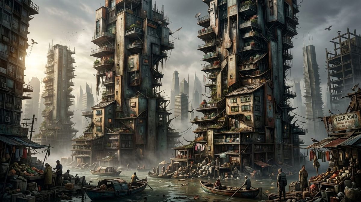This image shows photorealistic high-rise housing in a vivid, dystopian cityscape wasteland. Experience urban decay with dramatic lighting and volumetric fog, captured in 8K resolution.