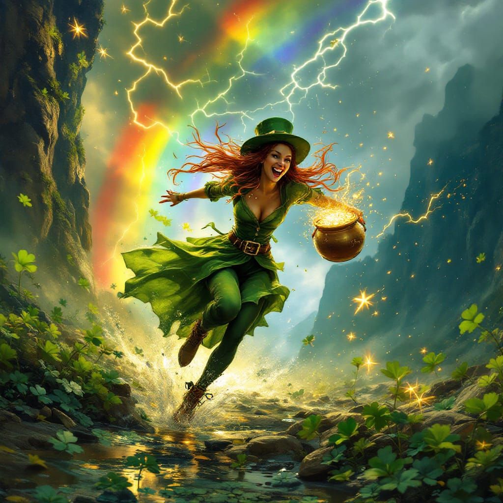 Subject: a wild, laughing enchanting female leprechaun sprinting along a rainbow with a pot of gold slung over her shoulder like stolen treasure