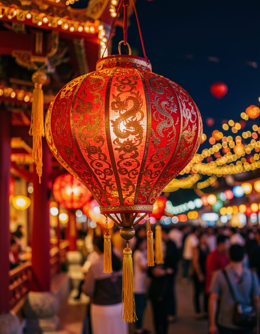 Close-up perspective of an elaborate, intricate red silk lantern during a night festival. The intricate patterns and golden tassels are glowing with intense light. In the out-of-focus background, traditional architecture, festive crowds, and streams of floating lights create a beautiful color palette ...