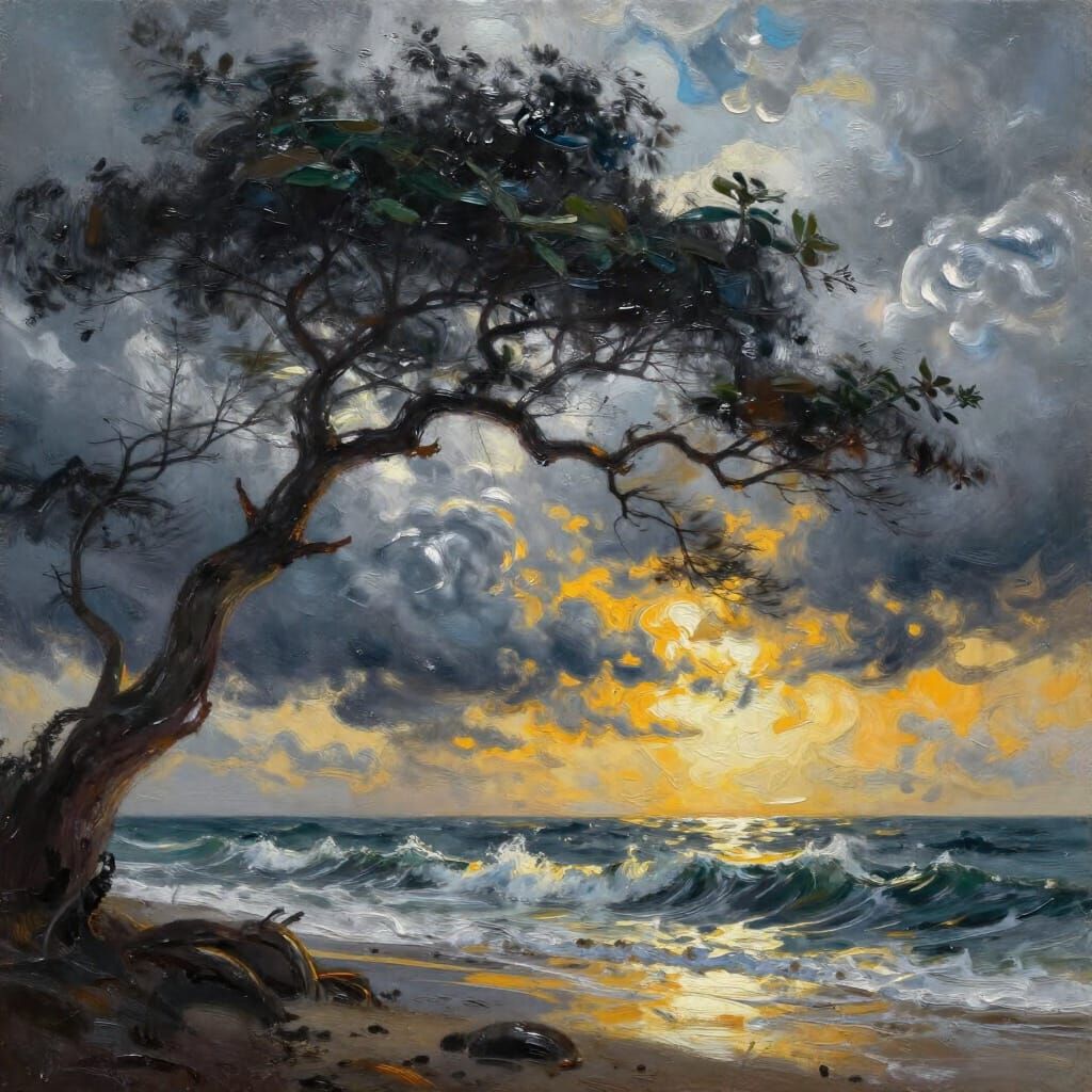 This oil painting captures dramatic motion with dark, horizontally bending trees blurred by a slow shutter speed. The turbulent sea and heavy clouds create a powerful, stormy atmosphere with rich textures.