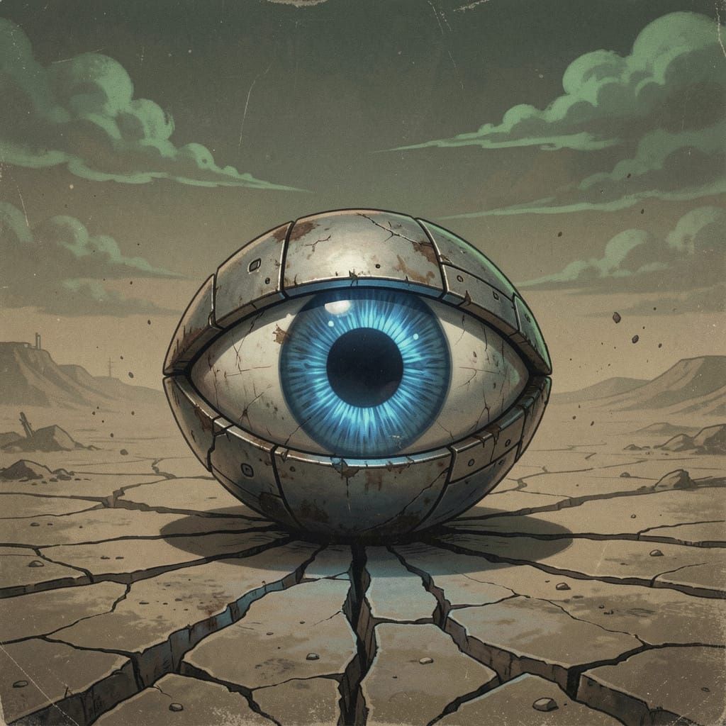 This image shows a single, distressed robotic eye glowing with blue light in a cracked, futuristic wasteland. The art style is gritty sci-fi concept art with atmospheric lighting and textured details.