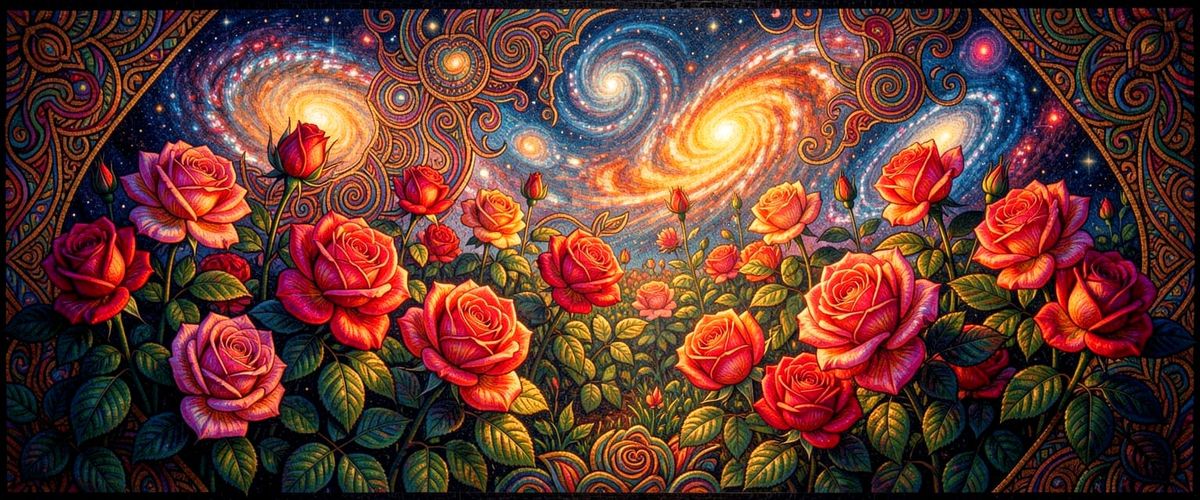 2/15/2025-byzantine mosaic photorealistic psychedelic zentangle cosmic galactic intricately detailed roses in a garden UV Blacklight Thomas Kinkade Art By Archangel Tara