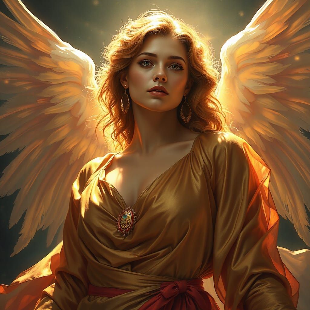 This hyperrealistic digital painting features a radiant woman with golden skin, adorned in iridescent silks. Dramatic lighting and rich colors emphasize her divine strength and allure.