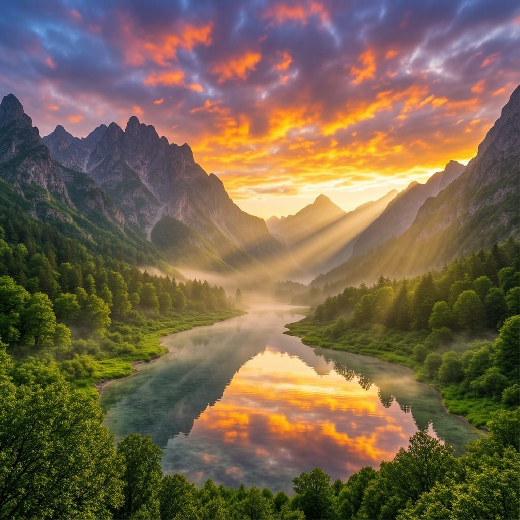 This image showcases majestic mountains at sunrise with a dramatic sky and glowing clouds. A crystal-clear river reflects the scene, with mist and volumetric light creating a cinematic atmosphere in hyper-realistic 8k.