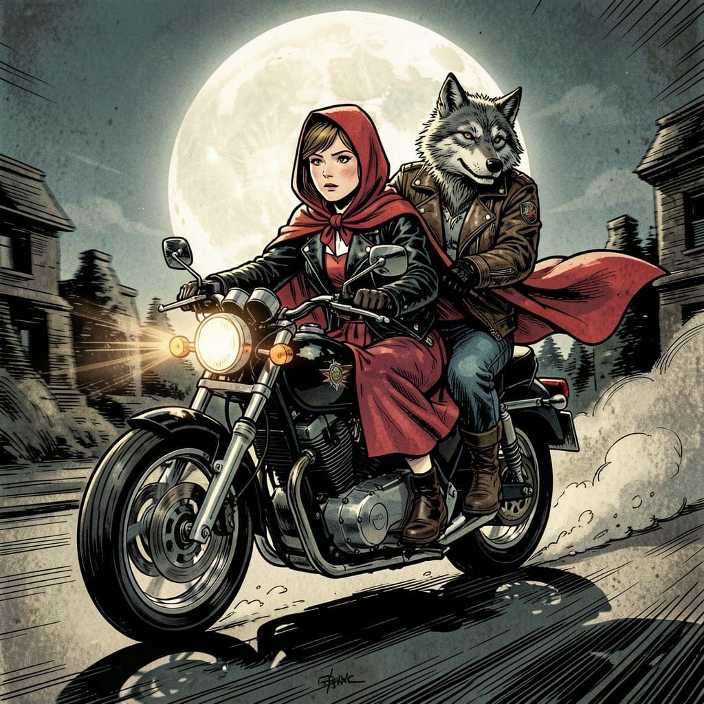 This image depicts Red Riding Hood on a powerful motorcycle with the Big Bad Wolf. Rendered in a gritty comic book style with cinematic lighting and moody colors, it shows a dramatic night scene.