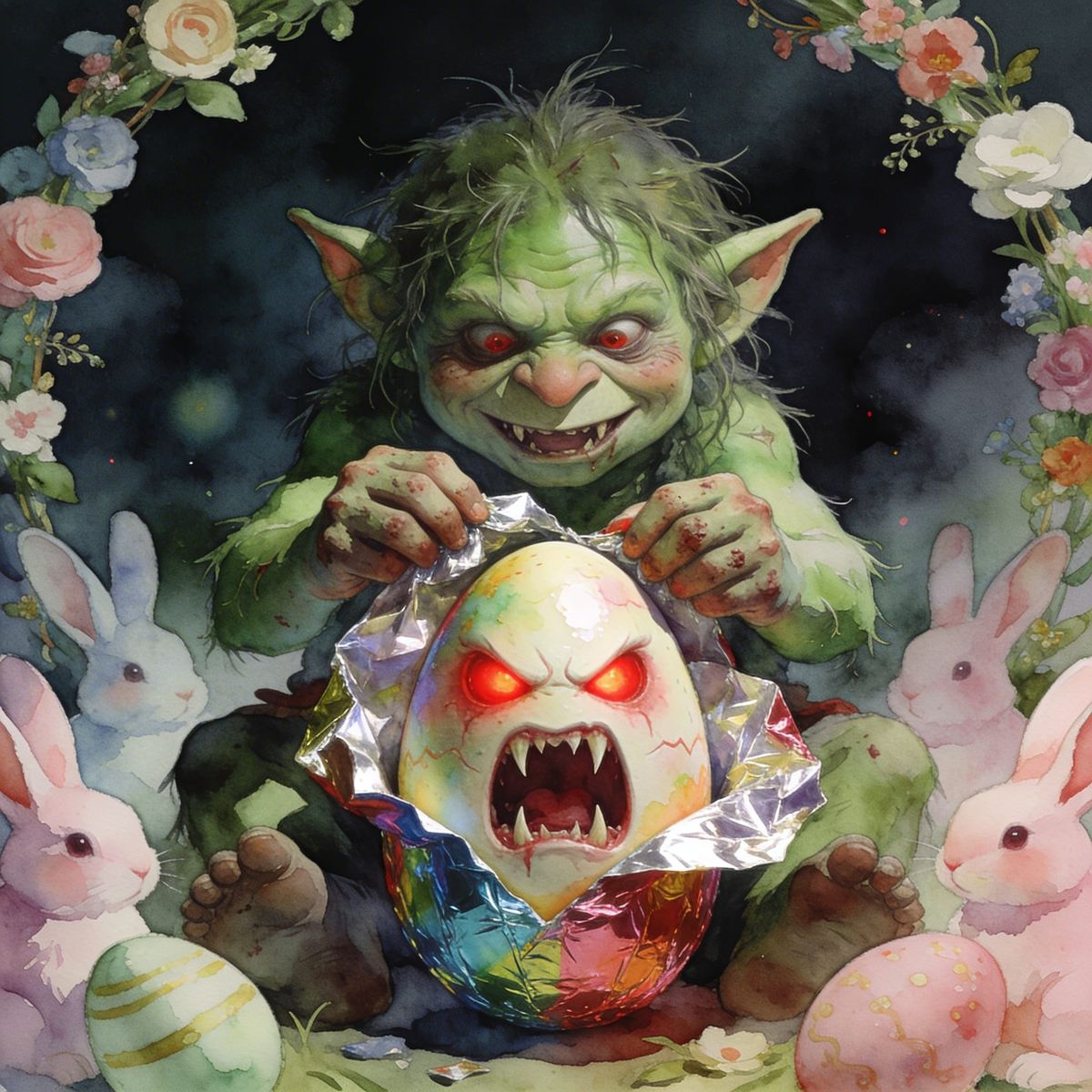 A surreal and scary storybook illustration of a cute, ugly troll unwrapping an Easter egg that reveals a screaming, red-eyed anthropomorphic egg. Rendered in a detailed watercolor style with deep, muted colors.