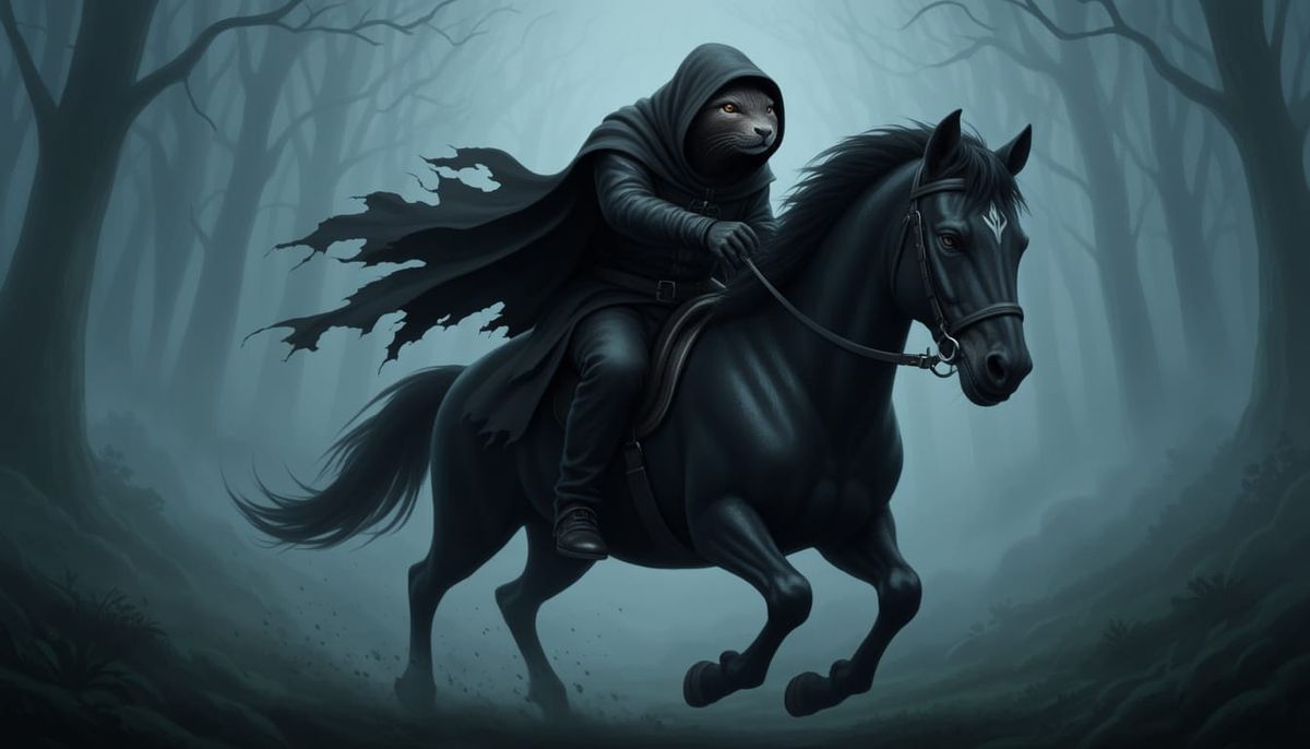 This striking image depicts a menacing Nazgûl-otter hybrid on a shadowy warhorse, cloaked and hooded. Set in a misty forest with dramatic lighting, it captures a dark fantasy atmosphere.