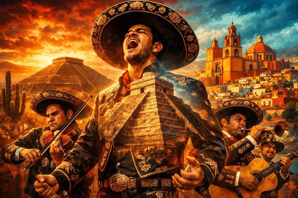 This image presents a hyper-realistic double exposure blending Mexican culture, cities, and landscapes. It features a mariachi band superimposed with ancient pyramids and vibrant city scenes, set against a desert sunset.