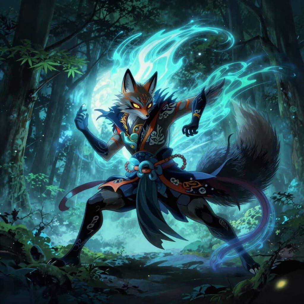 This image shows a dynamic illustration of a Japanese fox spirit, a Kitsune, mid-transformation with glowing eyes and ethereal tails. It's rendered in a vibrant, Ukiyo-e inspired digital art style.