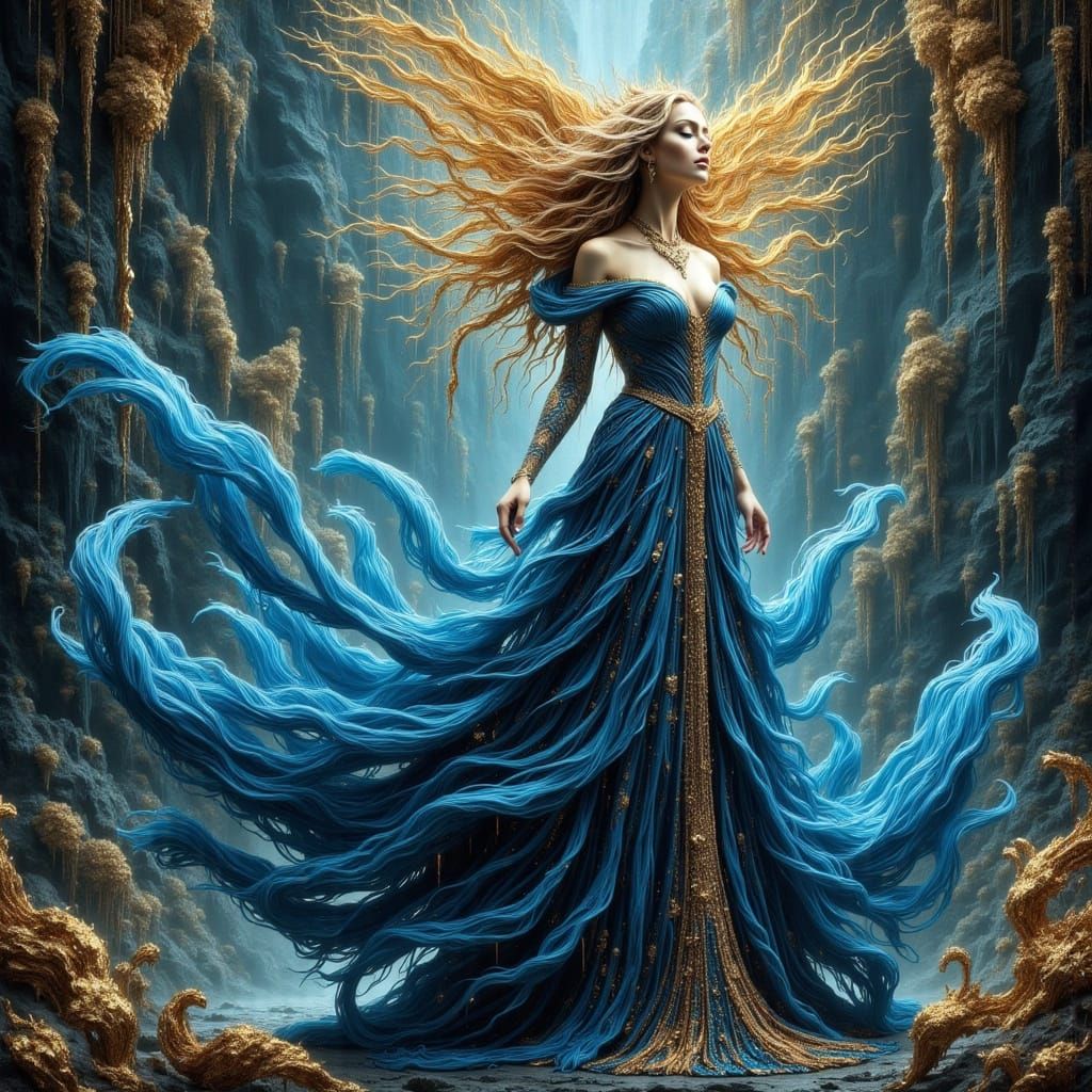 <lora:Memento Mori:1.0> <lora:Celebrate 2:1.0> <lora:divineOil:1.0> <lora:Beautiful women:1.0> tall beautiful Being dressed in a long flowing spiralling gown decorated with a magnificent display of bright bule with deep shades of azure with a delicate display of golden threads, the gown flowing in the ...