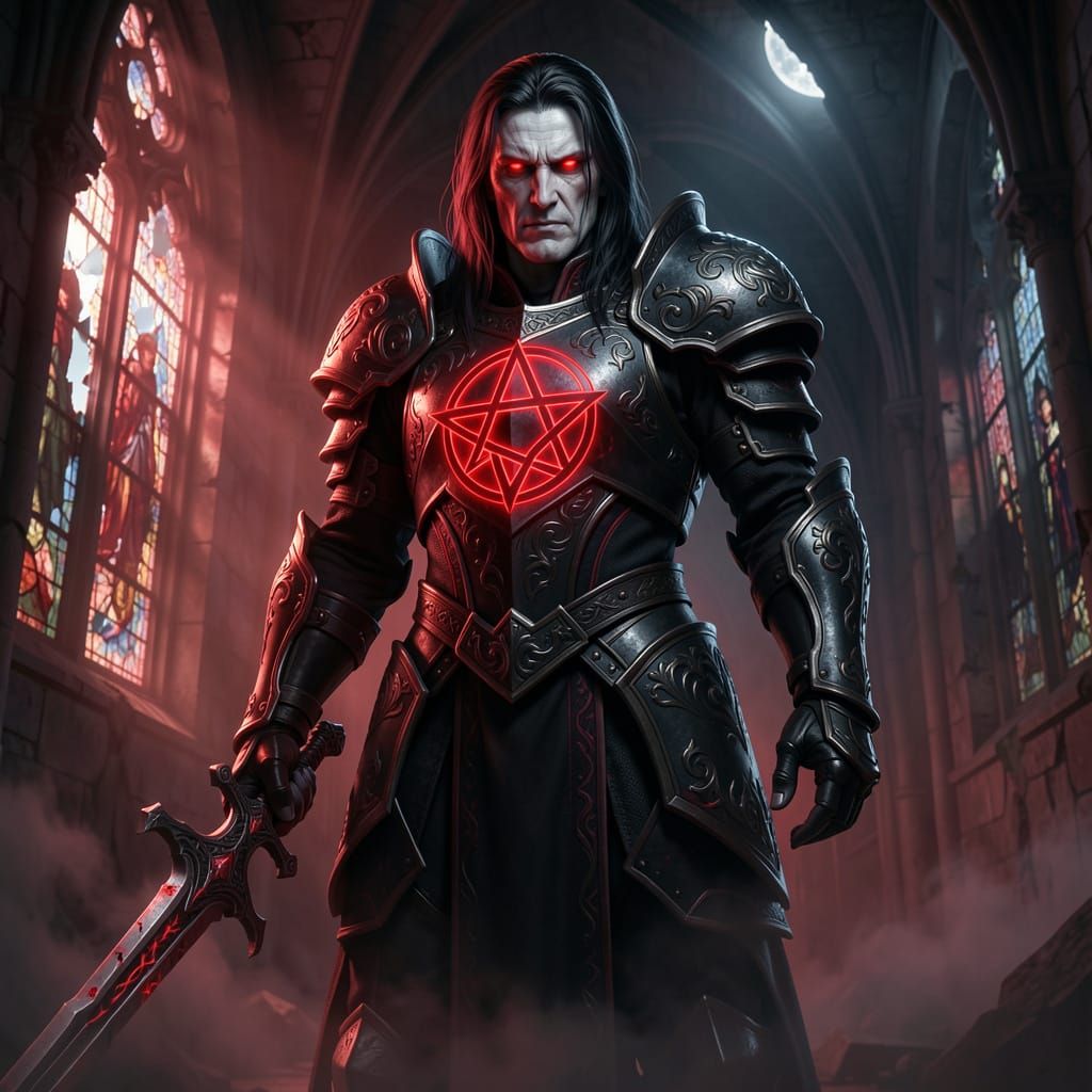 This image shows a pale vampire lord in ornate gothic armor with a glowing red pentagram. A dark fantasy scene with cinematic lighting, fog, and a cursed sword.