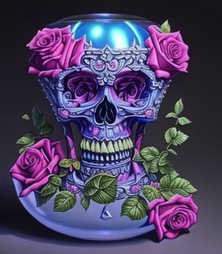 A vibrant image of a skull hourglass surrounded by roses. The artwork is rendered with hyperdetailed textures and graceful gradients, creating a surreal, dreamlike mosaic.