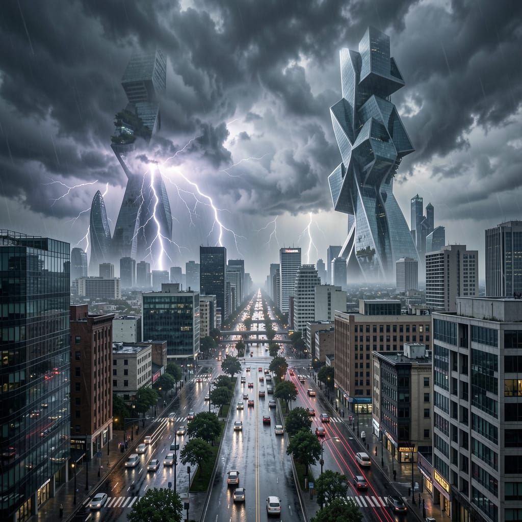 Easily generate your own ultra-photorealistic cinematic cityscapes during atmospheric storms with our free AI tool.