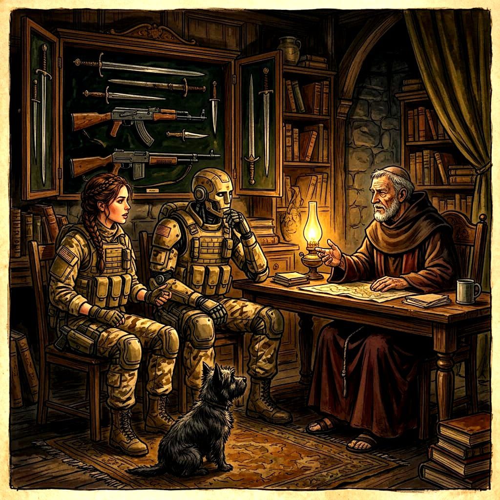 This image depicts a fantastical storybook scene. A woman and robot converse with a monk in a study filled with legendary weapons, featuring a small dog.