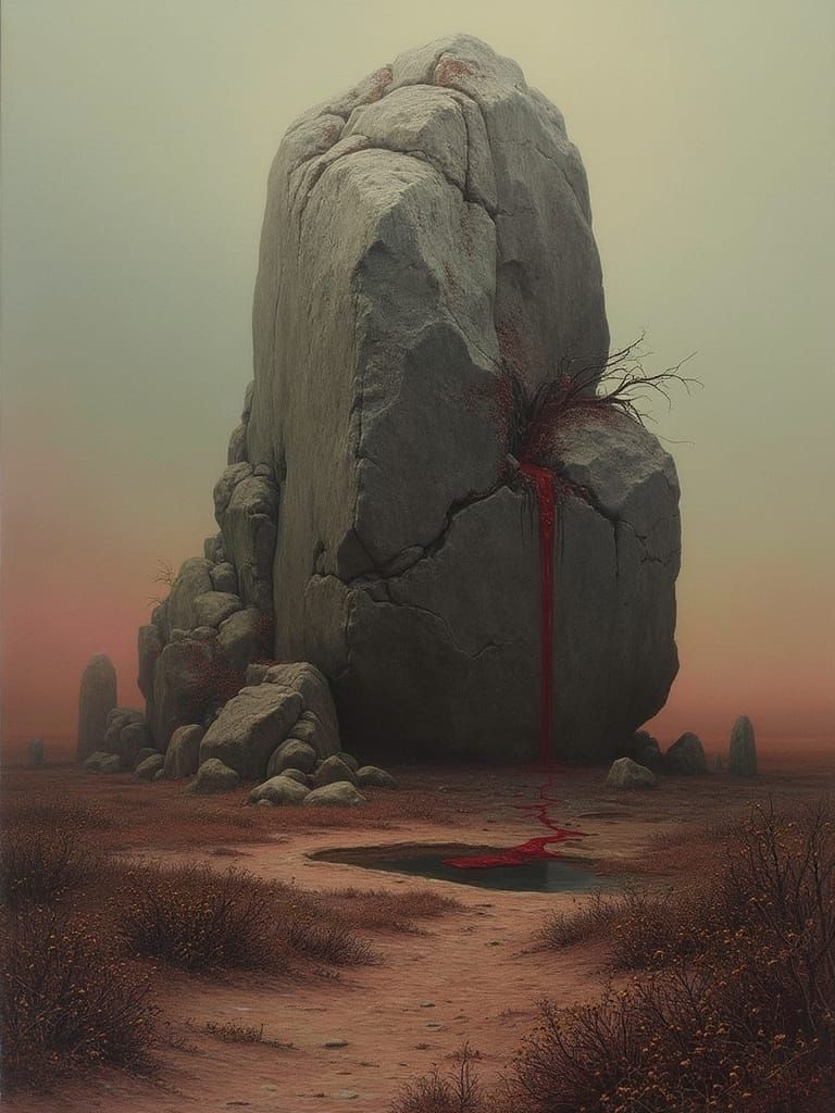 This image depicts a weathered ancient boulder in a vast, misty landscape at dawn. A stream of blood flows from a crack, while gnarled vines and thorn bushes surround its base. Sombre tones convey despair and loss.