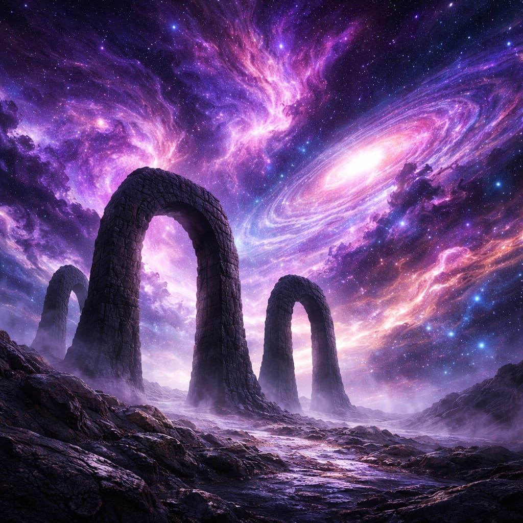 This image shows towering dark stone arches set against a swirling nebula sky filled with vibrant cosmic colors. It captures a surreal, deep-space fantasy digital painting.